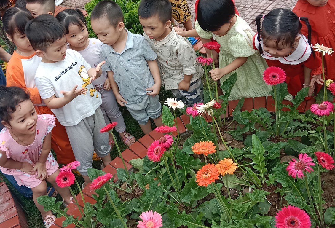 👉👉Nhìn từ phía ngoài cổng vào, nhà trường tận dụng những khoảng đất trống trồng nên những bông hoa khoe sắc vừa đẹp vừa để các con quan sát, ngửi, ngắm, mùi thơm nhẹ nhàng của hoa đến say mê.